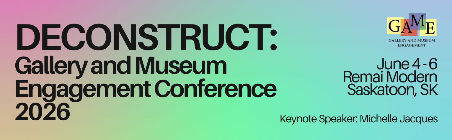 Our keynote speaker for 2026 is curator and writer Michelle Jacques, who is renowned for her expertise in advocating for institutional change, combining historical and contemporary art, and for her championship of regional artists. Other sessions include a visit to Wanuskewin Cultural Heritage Center, case studies, land-based engagement, panel discussion, special presentations, tours, and more. Most importantly, what GAME does best is creating networks among museum educators across the country. We are excited to hold space with you as we connect through ideas, community, and the land upon which we will gather.